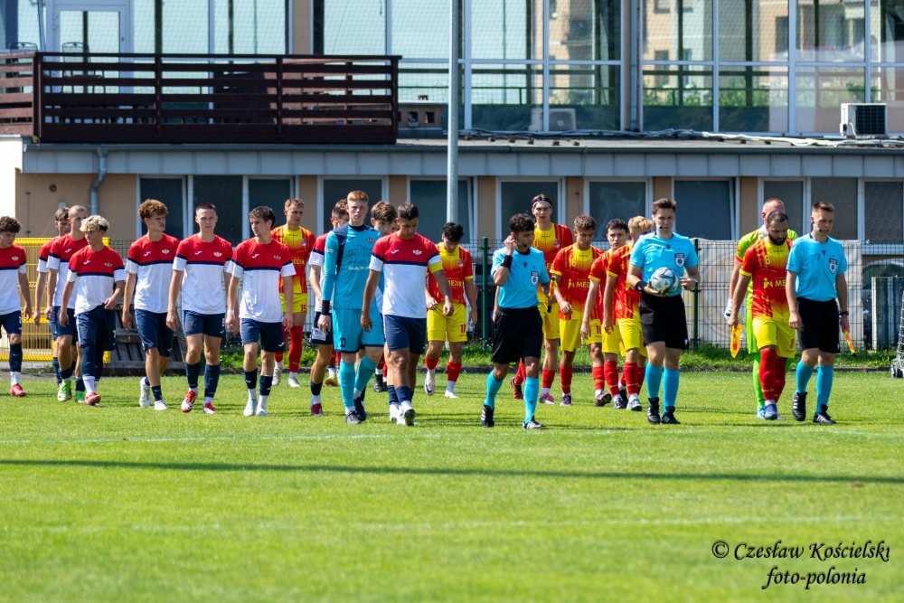 Od samego początku Meblorz starał się narzucić swój styl gry i zmusić Polonię do obrony. Młodzi poloniści jednak skutecznie się bronili i nie pozwalali bardziej doświadczonym rywalom na zbyt wiele. Dodatkowo ekipa Jakuba Budycha sama skutecznie starała się kontratakować. W 24 minucie na bramkę rywali sprzed pola karnego uderzał Bartosz Kadrzyński a piłka zatrzymała się na poprzeczce. Chwilę później dwukrotnie z rzutu rożnego dośrodkował Wiktor Motyl ale za każdym razem Meblorz skutecznie się bronił. Do końca pierwszej połowy żadnemu z zespołów nie udało się pokonać bramkarza rywali i pierwsza część spotkania kończy się bezbramkowym remisem.