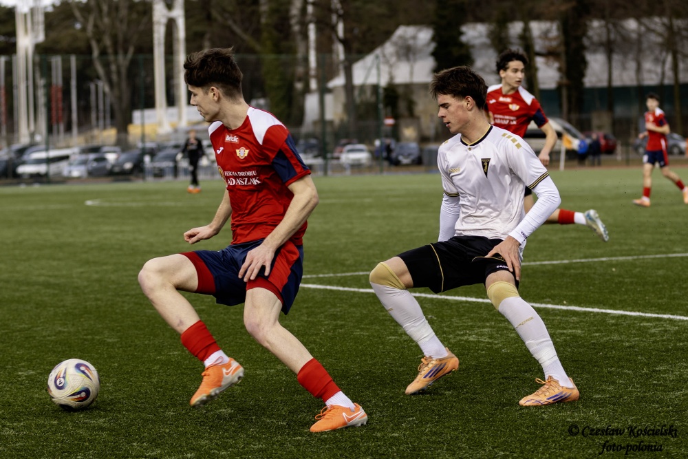 Pierwsze minuty spotkania to prawdziwy szturm graczy ze Środy Wielkopolskiej. Już w 30 sekundzie spotkania Jakub Wilczyński wykorzystał długie zagranie od Piotra Skrobosińskiego i dał prowadzenie polonistom. Szybko strzelony gol jeszcze tylko napędził podopiecznych Macieja Rozmarynowskiego którzy nie zamierzali zwalniać tempa. W 14 minucie fantastyczną asystą popisał się Patryk Mikita, a formalności dopełnił Szymon Sarbinowski który z bliska wepchnął piłkę do bramki. Dwubramkowe prowadzenie nieco uśpiło polonistów którzy dali rywalowi nieco więcej miejsca a to Pogoń skrzętnie wykorzystała. Zespół ze Szczecina częściej zaczął być przy piłce i częściej zagrażał bramce Miłosza Garstkiewicza. Ten jednak do końca pierwszej części spotkania zachował czyste konto a najbliżej szczęścia był Kacper Stanowski którego uderzenie z bliska przeleciało nad poprzeczką.
