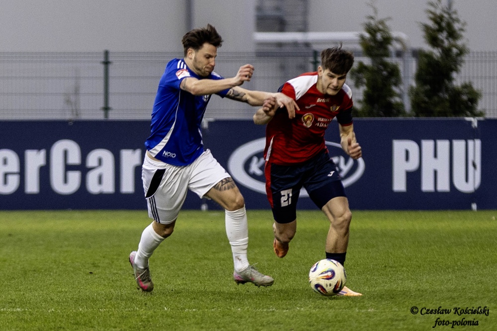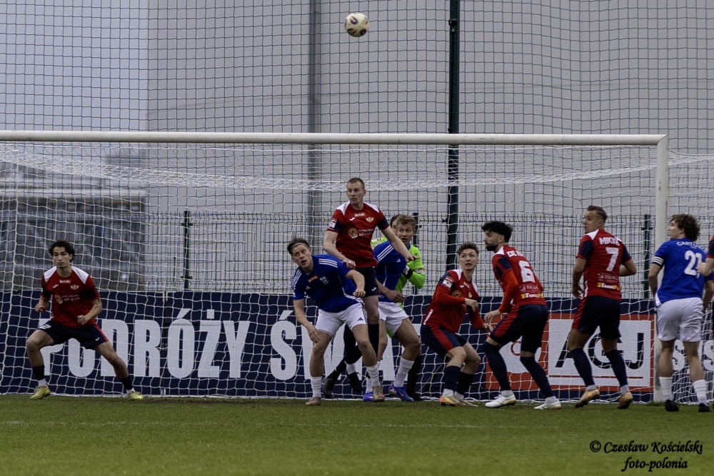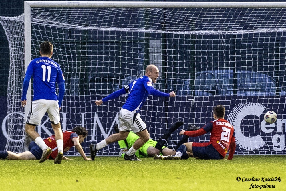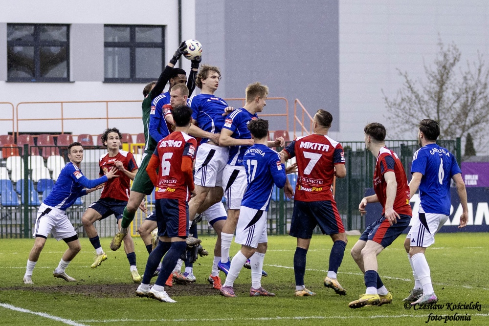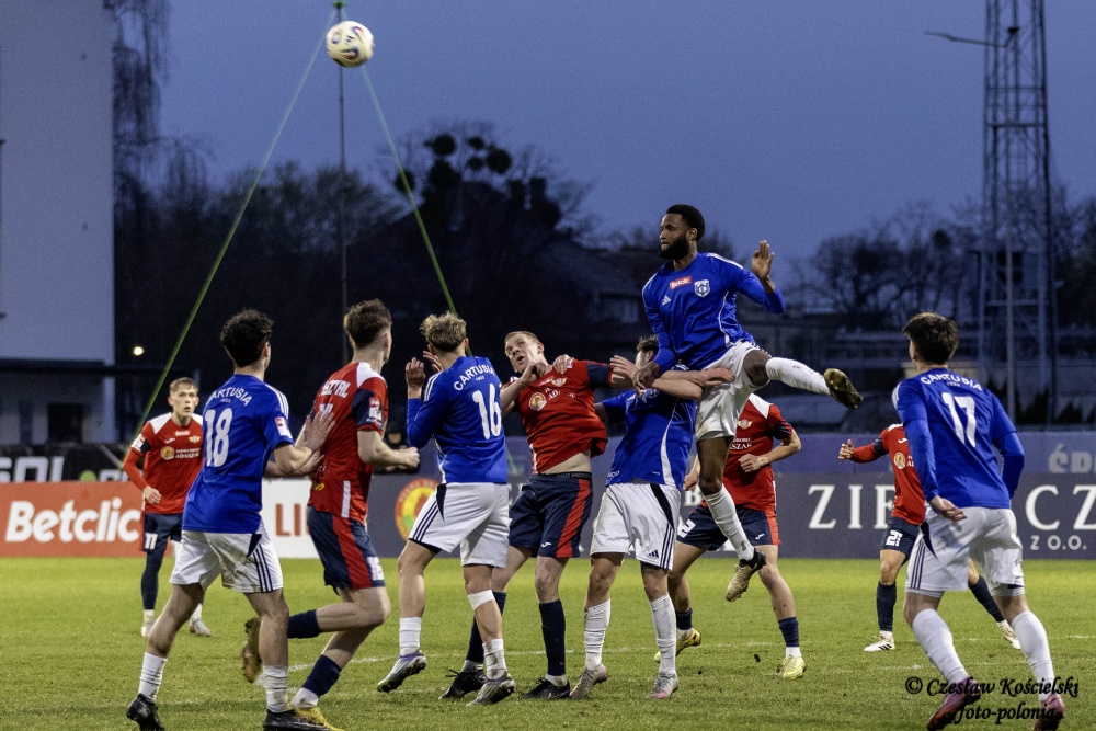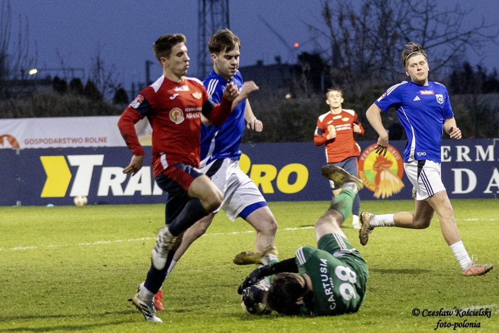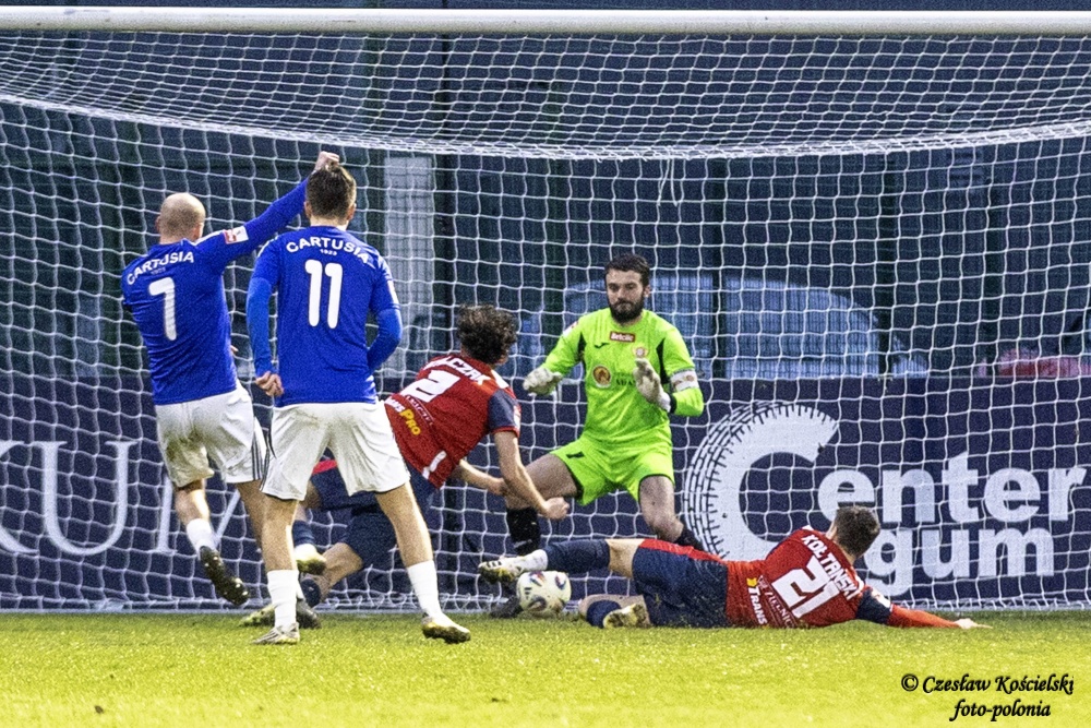 Sobotni pojedynek rozpoczął się od ataków Polonii Środa. Ale uderzenia Marcela Misztala, Jonatana De Amo czy Damiana Kołtańskiego padały łupem bramkarza Cartusii Pawła Depki. Z biegiem czasu spotkanie zaczęło się jednak wyrównywać a coraz częściej do głosu dochodzili rywale. Na szczęście w bramce Polonia Środa mogła liczyć na dobrze dysponowanego Przemysława Frąckowiaka. Tym samym ostatecznie pierwsza część spotkania kończy się bezbramkowym remisem.