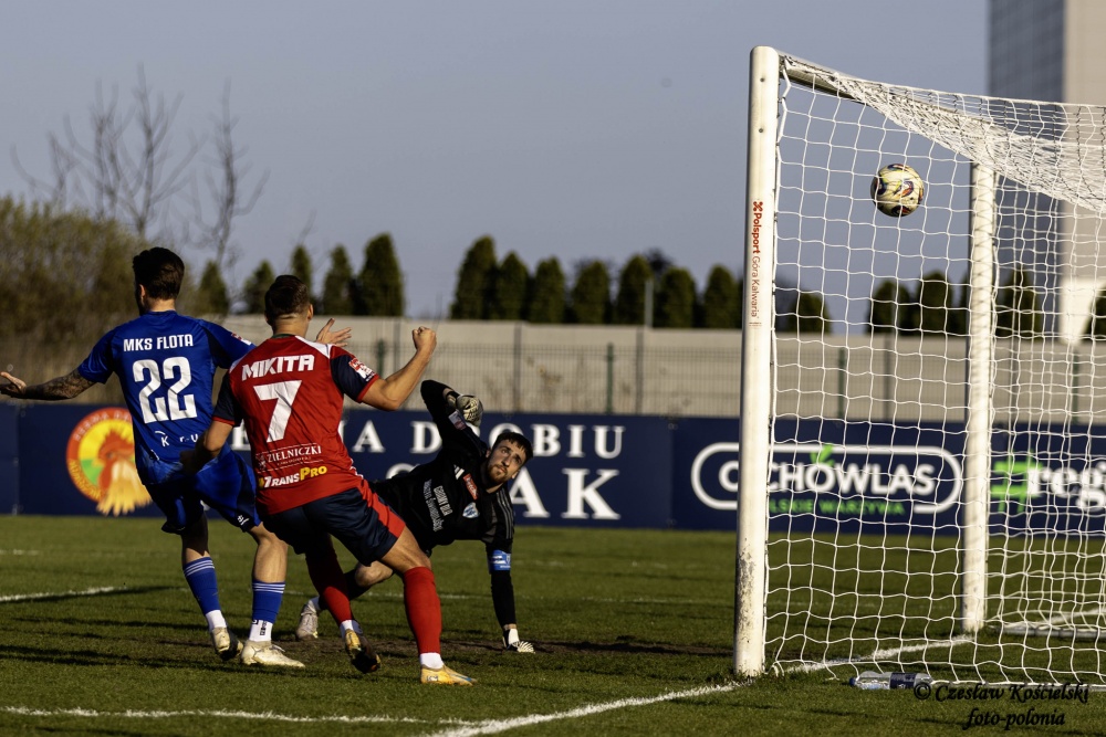 Flota przed tym meczem zajmowała piąte miejsce co było jasnym sygnałem że podopiecznych Macieja Rozmarynowskiego czeka ciężka przeprawa. Mecz od samego początku toczony był w konwencji radosnego futbolu a obie ekipy odważnie postawiły na atak. Już w 5 minucie uderzenie z boku pola karnego Marcela Misztala najpierw trafia w Szymona Dobę a dobitka wpada obok bezradnego bramkarza Floty i średzianie wychodzą na prowadzenie. Tym prowadzeniem nie nacieszyli się jednak zbyt długo. Minutę później błąd tego który dał prowadzenie Polonii wykorzystują Wyspiarze a Hubert Turski bez większych kłopotów doprowadza do wyrównania. Polonia odpowiada pięć minut później. Patryk Mikita swoim pressingiem zmusił do błędu bramkarza Floty który podał piłkę wprost do Jakuba Szczypka a ten pewnym uderzeniem niemalże z połowy boiska umieszcza ją w bramce. W 18 minucie po podaniu Marcela Misztala świetnym uderzeniem sprzed pola karnego popisał się Damian Kołtański i było 3:1. Na to trafienie goście odpowiedzieli dwie minuty później. Po zamieszaniu w polu karnym po rzucie rożnym z bliska piłkę do średzkiej bramki skierował ponownie Hubert Turski. Jeszcze przed przerwą poloniści podwyższyli swoje prowadzenie. W 26 minucie po dośrodkowaniu Szymona Sarbinowskiego piłkę do bramki rywali strzałem głową skierował Szymon Doba. Spokojne dwubramkowe prowadzenie gracze Polonii Środa dowieźli do końca pierwszej części spotkania.